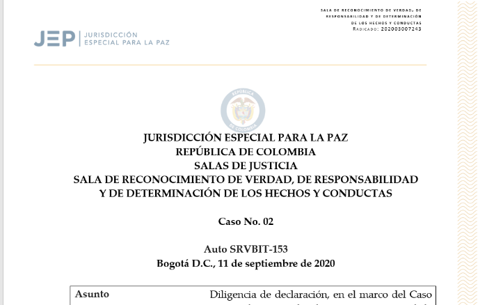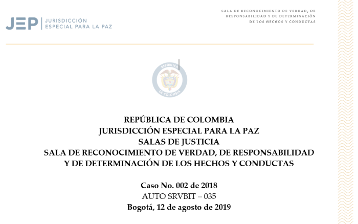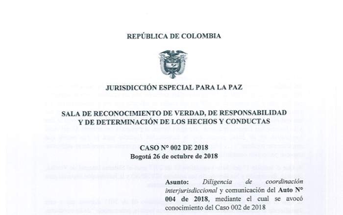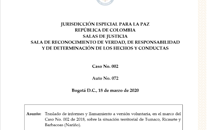 El 10 de julio de 2018 la Sala de Reconocimiento de Verdad, de Responsabilidad y de Determinación de los Hechos y Conductas de la JEP abrió el Caso 02 denominado: Situación territorial de Ricaurte, Tumaco y Barbacoas (Nariño) (Auto 04 de 2018). Este es uno de los casos territoriales de la JEP que investiga las graves violaciones a los derechos humanos y al Derecho Internacional Humanitario (DIH), presuntamente atribuibles a miembros de las FARC-EP y de la fuerza pública, en el periodo comprendido entre 1990 y hasta el 1° de diciembre de 2016 en tres municipios del departamento de Nariño: Ricaurte, Tumaco y Barbacoas.