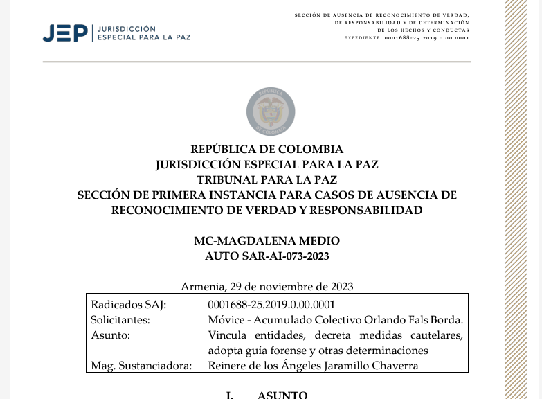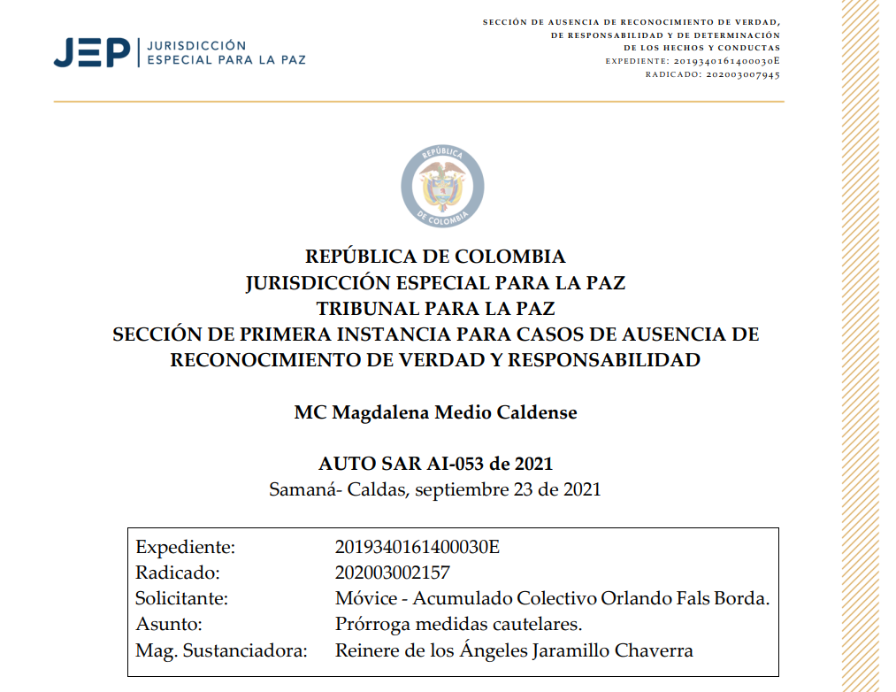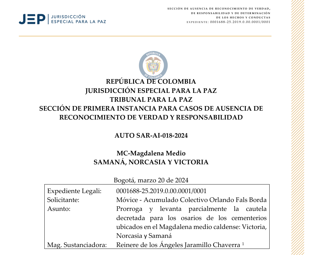 FUNDECOS, el CEDAT y EQUITAS presentaron un informe a la JEP en 2019 en el que registraron y documentaron 187 casos de desaparición forzada en la región del Magdalena Medio Caldense. Con base en esta información, se ordenó a la Unidad de Investigación y Acusación de la JEP (UIA), compilar toda la información disponible en dichos municipios, lo que permitió ubicar lugares de interés forense dada la inhumación irregular de posibles víctimas del conflicto armado en la región. Uno de los lugares de interés forense fue el osario común del cementerio San Agustín, donde se habían dispuesto, en contra de lo establecido por la normatividad, cuerpos de personas no identificadas dadas por desaparecidas y víctimas de desaparición forzada. Posteriormente, la Sección de Ausencia de Reconocimiento de la JEP decretó medidas cautelares mediante el Auto 020 del 18 de septiembre de 2020.