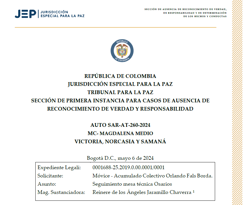 Posteriormente, se conformó una mesa técnica a fin de consolidar un instrumento guía para el abordaje de osarios, que contó con la participación de las organizaciones internacionales y las entidades y organizaciones peticionarias. Esta Guía fue aprobada mediante Auto AI 073 de noviembre 2023 y con ella el GATEF y la Fundación de Antropología Forense de Guatemala; en acompañamiento y articulación con la UBPD, el Grupo Interno de Búsqueda, Identificación y Entrega de Personas Desaparecidas (GRUBE) de la Fiscalía y el INMLCF, procedieron a realizar el piloto de implementación en el osario del cementerio San Agustín de Samaná (Caldas) entre el 17 de abril y el 3 de mayo de 2024.  El análisis forense arrojó 171.806 estructuras óseas recuperadas (partes aisladas de cuerpos).